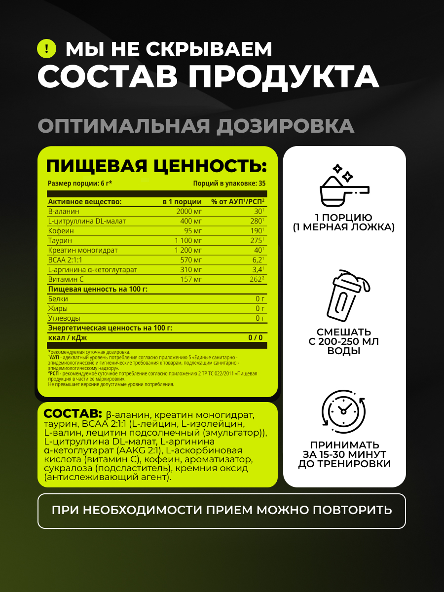 Универсальный предтренировочный энергетический комплекс, предназначенный для быстрой подготовки организма спортсмена к интенсивным физическим и психологическим нагрузкам. Он повышает потенциал организма: усиливает его естественное энергетическое обеспечение во время больших физических нагрузок за счет вовлечения использования запасов жиров, снижает эффект «закисления» мышц молочной кислотой, способствуя увеличения длительности и интенсивности тренировок.