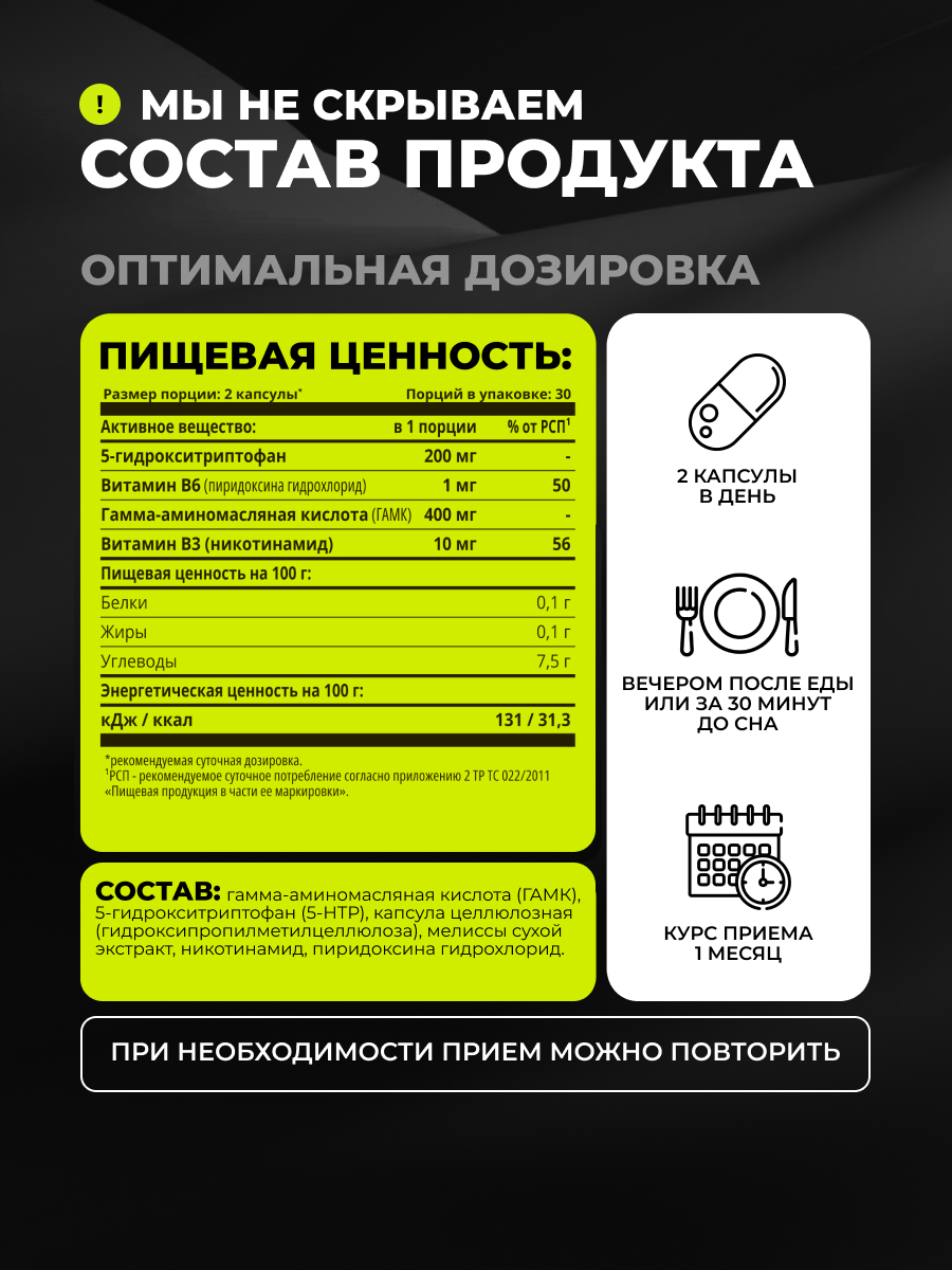 5-HTP - природный антидепрессант, который не вызывает привыкания. Аминокислота способствует синтезу гормонов серотонина и мелатонина. Прием 5-гидрокситриптофана улучшает засыпание и качество сна, стабилизирует эмоциональный фон, улучшает настроение, помогает легче справляться со стрессом.