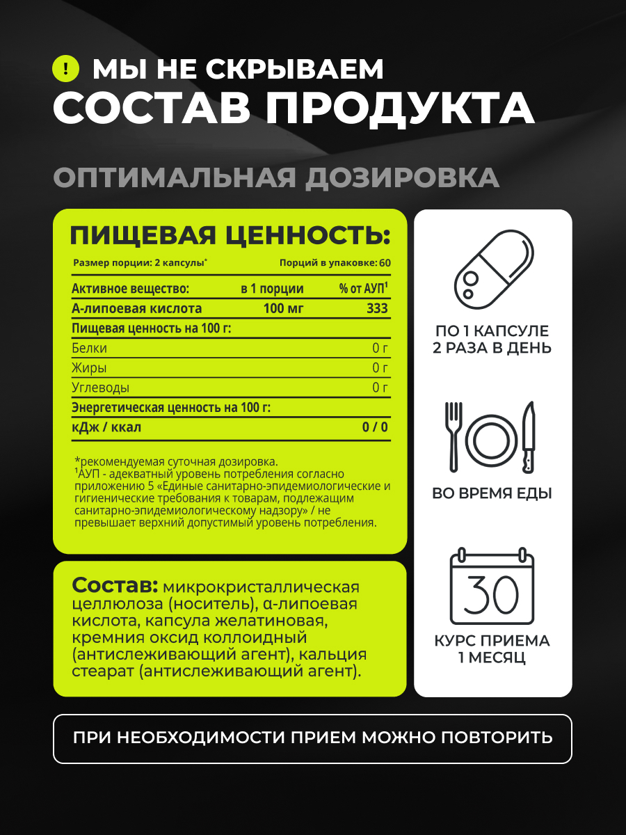 Альфа Липоевая кислота улучшает усвоение глюкозы, что делает ее незаменимой добавкой не только при ведении активного образа жизни, но и при сахарном диабете. Эта жирная кислота присутствует в абсолютно каждой клетке нашего организма и играет ключевую роль в обмене веществ, способствуя преобразованию глюкозы в энергию.