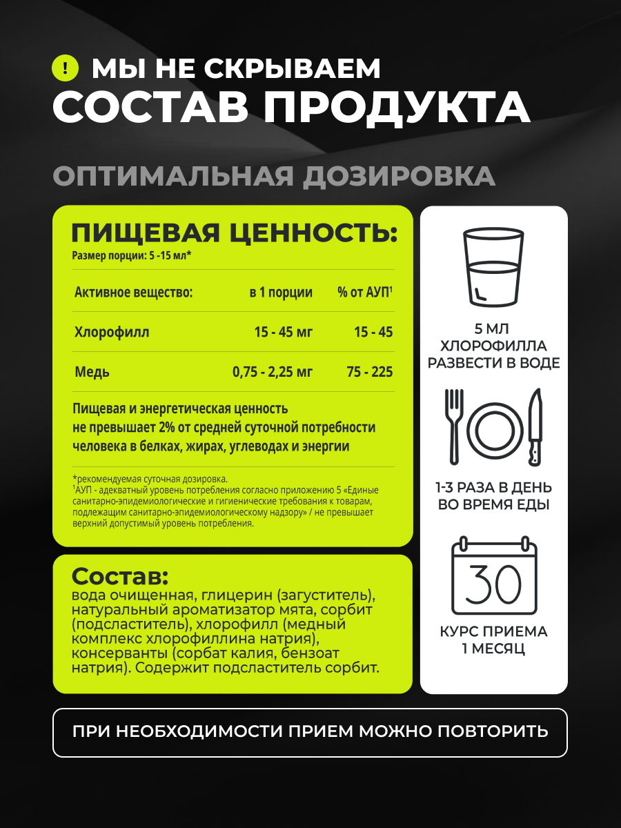 Натуральный Жидкий Хлорофилл + Медь от 1WIN — это мощный антиоксидантный комплекс, который применяется для похудения, укрепления иммунитета и очищения организма от шлаков, токсинов и свободных радикалов. Жидкая форма обеспечивает быстрое и эффективное усвоение для заметного результата. Хлорофилл с мятой имеет свежий приятный вкус.