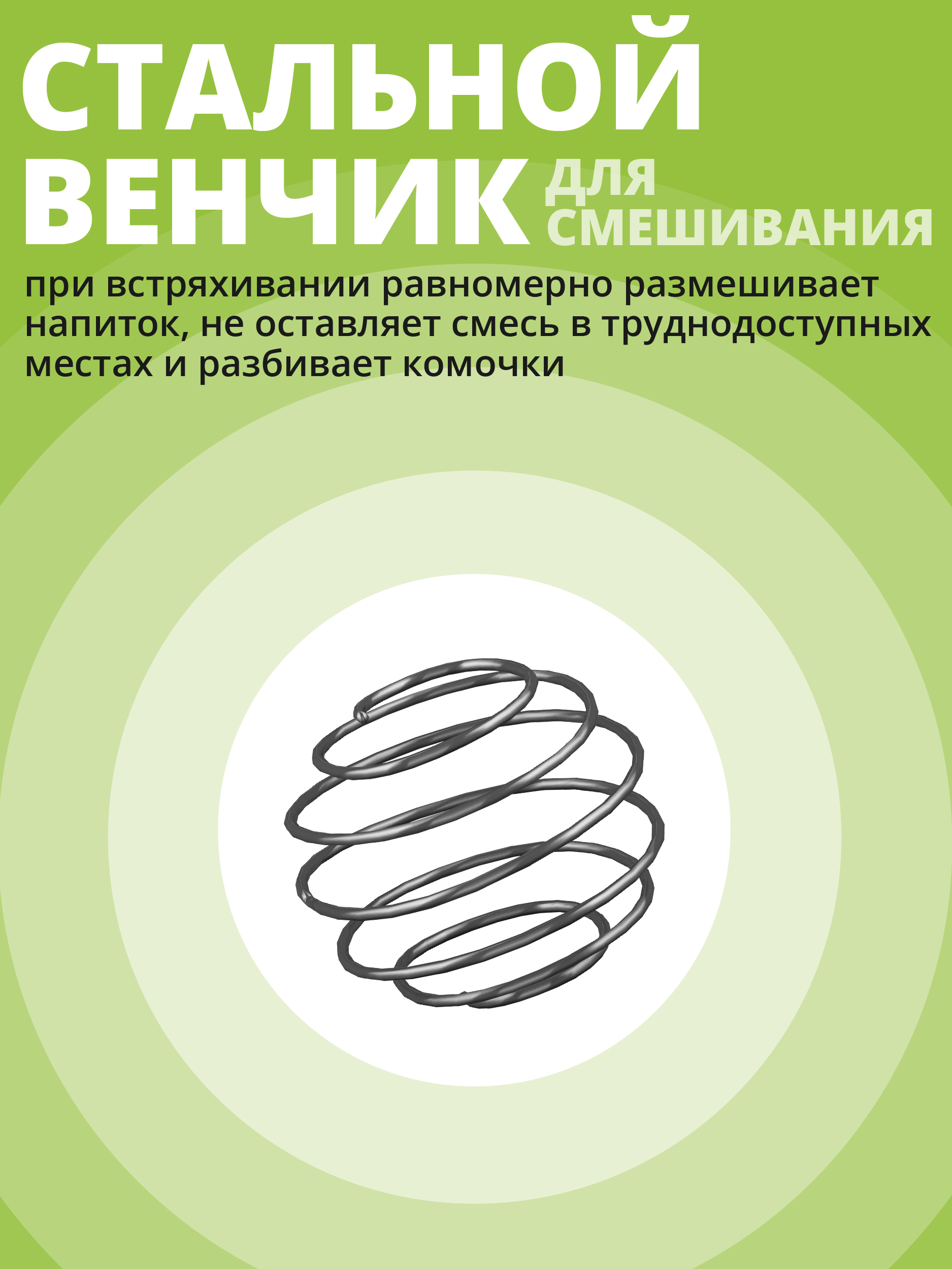 Шейкер позволяет быстро и легко приготовить напиток, где бы вы ни находились. Он имеет надежный герметичный клапан. Внутри есть шарик-венчик из нержавеющей стали. Пластик абсолютно безопасен даже при использовании в микроволновой печи.