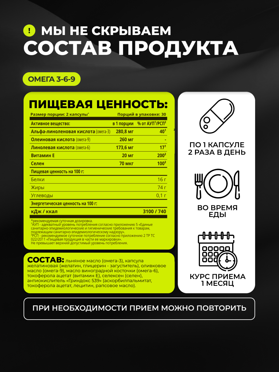 Комплекс омега 3-6-9 с селеном и витамином E способствует замедлению процессов старения. Ненасыщенные жирные кислоты увлажняют и питают кожу, избавляют от сухости и шелушения, разглаживают мелкие морщины. Прием добавки улучшает состояние волос и ногтей и способствует их укреплению. Жирные кислоты омега 3-6-9 защищают иммунную, нервную и сердечно-сосудистую системы, стимулируют обменные процессы, улучшают зрение. Селен предупреждает преждевременное старение клеток, защищает от свободных радикалов. Витамин E укрепляет волосы, предотвращает их ломкость, способствует эффективному росту. Этот витамин необходим для нормальной работы репродуктивной системы у женщин. В упаковке 60 капсул.