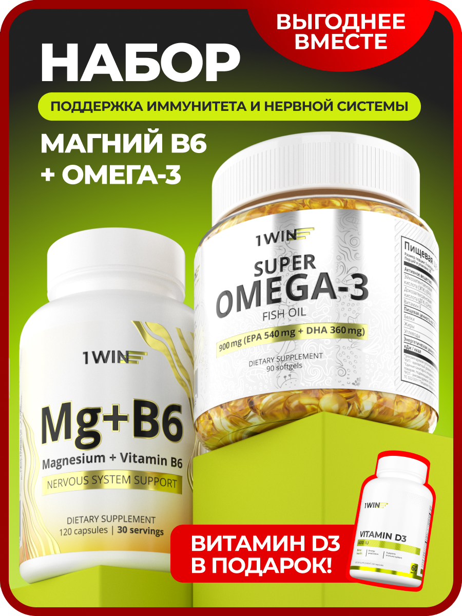 1WIN / Набор витаминов, Омега-3 90 капсул + Магний+В6 120 капсул + подарок витамин D3 600МЕ
