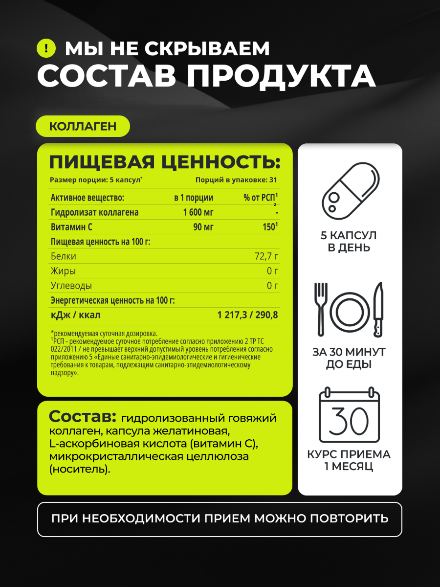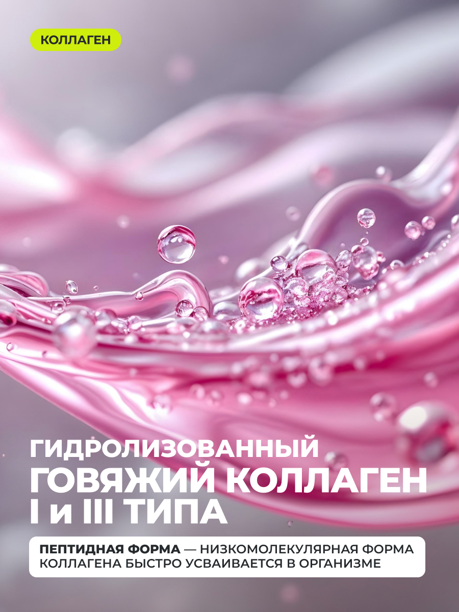 Говяжий коллаген замедляет процессы старения, оказывает омолаживающий эффект, повышая упругость и эластичность кожи. Восстанавливает структуру волос, улучшает их состояние и внешний вид, предотвращает выпадение. Позитивно влияет на здоровье костной ткани, суставов, хрящей. В упаковке 155 капсул.
