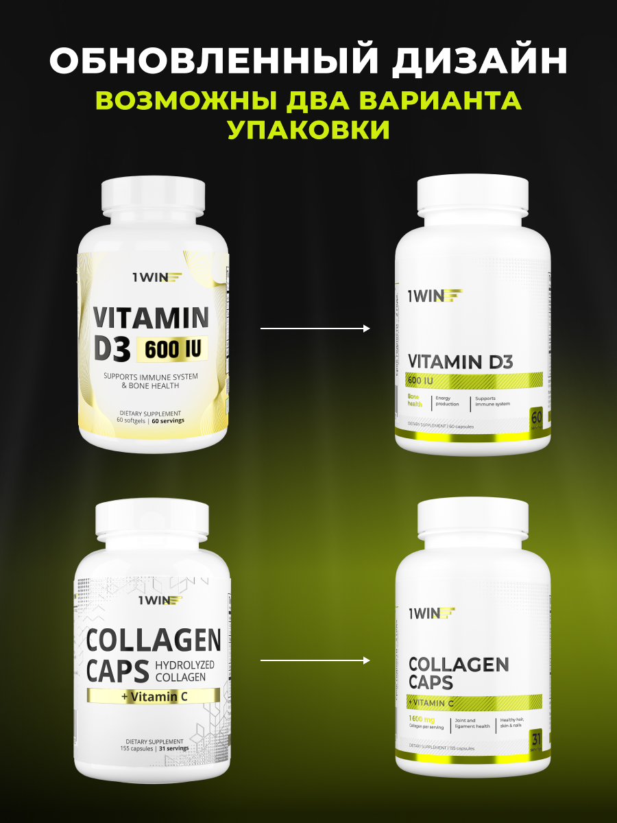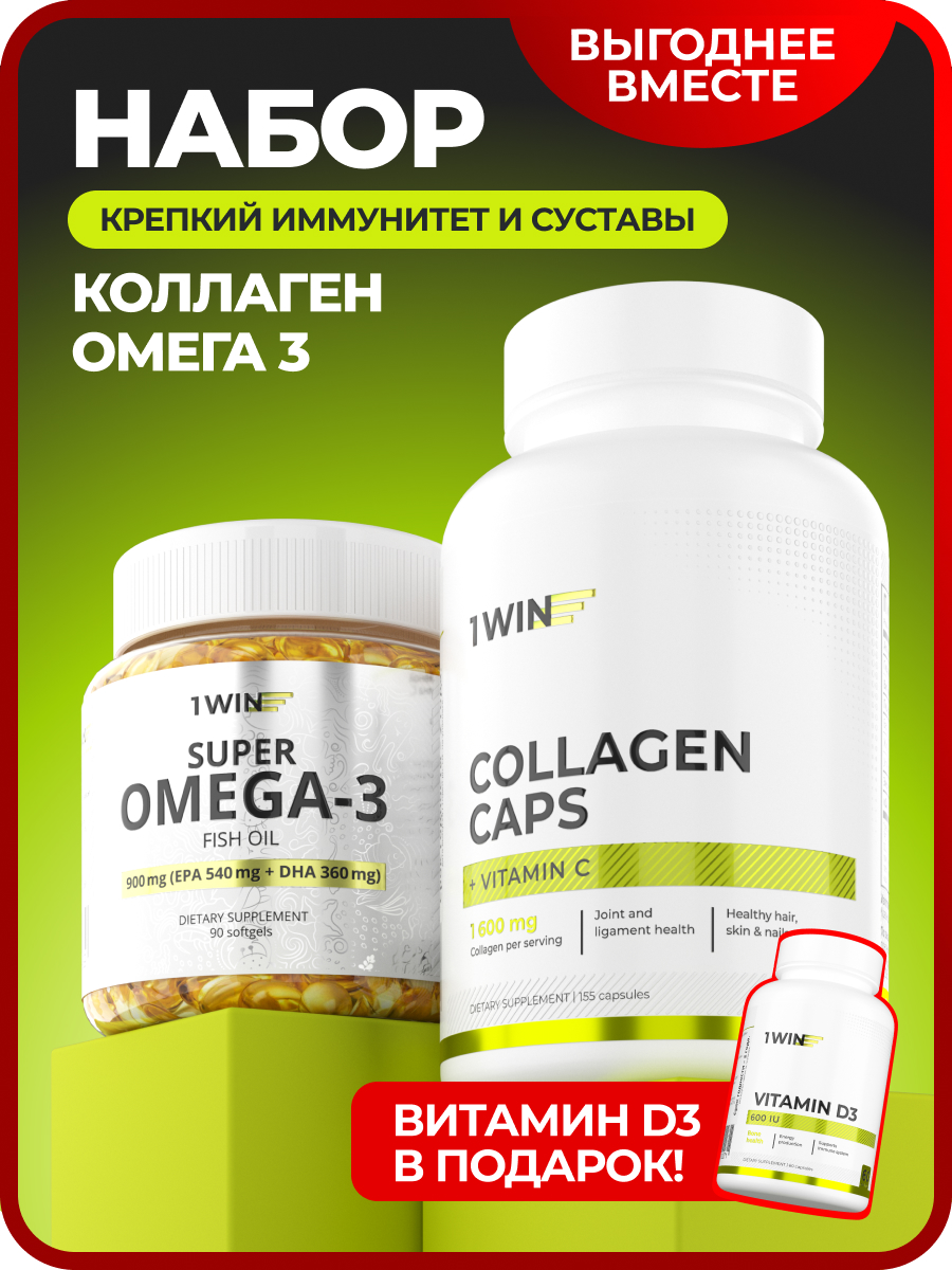 1WIN / Набор витаминов, Омега-3 90капсул + Коллаген 155 капсул + подарок Д3 600МЕ