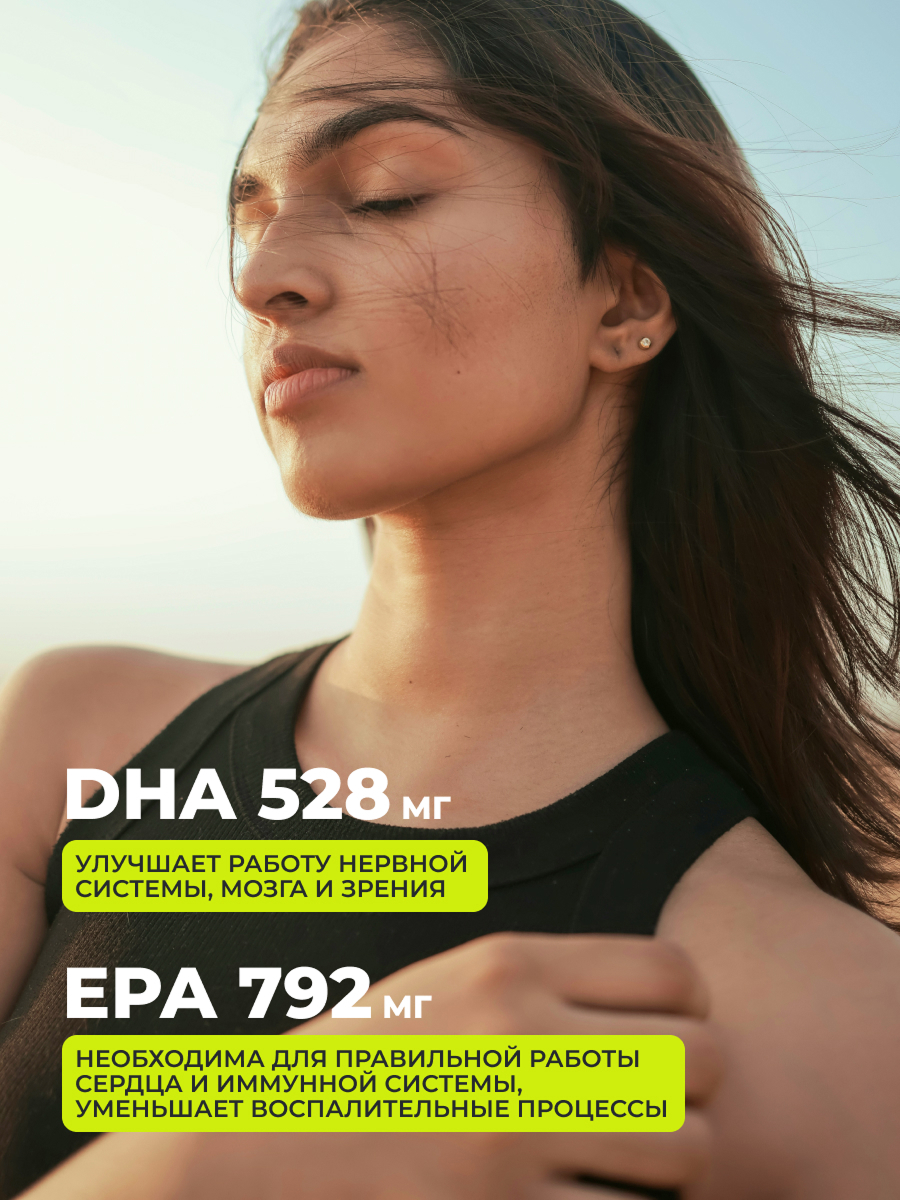 БАД содержит жирные кислоты омега 3 высокой концентрации. В одной капсуле ЭПК 972 мг и ДГК 528 мг. Рыбий жир быстро усваивается организмом, восполняя дефицит ПНЖК в организме.