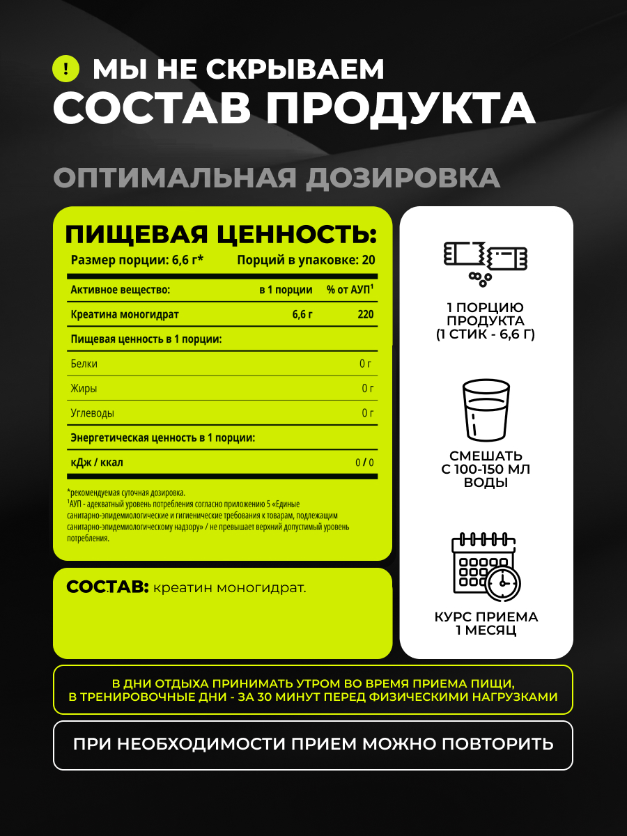 100% Чистый Креатин Моногидрат — спортивная добавка для увеличения продолжительности и качества тренировок. Спортивный коктейль без вкуса и без добавок не содержит красителей, ароматизаторов и подсластителей, в том числе мальтодекстрина. В одной порции (1 стик) содержится 6,6 гр креатина.