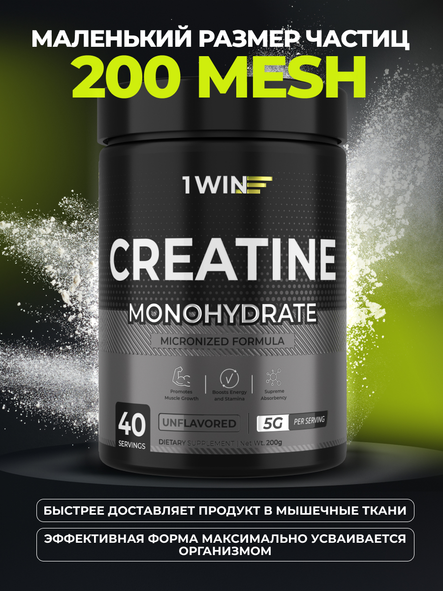 Креатин моногидрат с нейтральным вкусом от 1WIN — спортивная добавка для увеличения продолжительности и качества тренировок. Не содержит красителей, ароматизаторов и подсластителей, в том числе мальтодекстрина. В одной порции содержится 5 гр чистого креатина.
