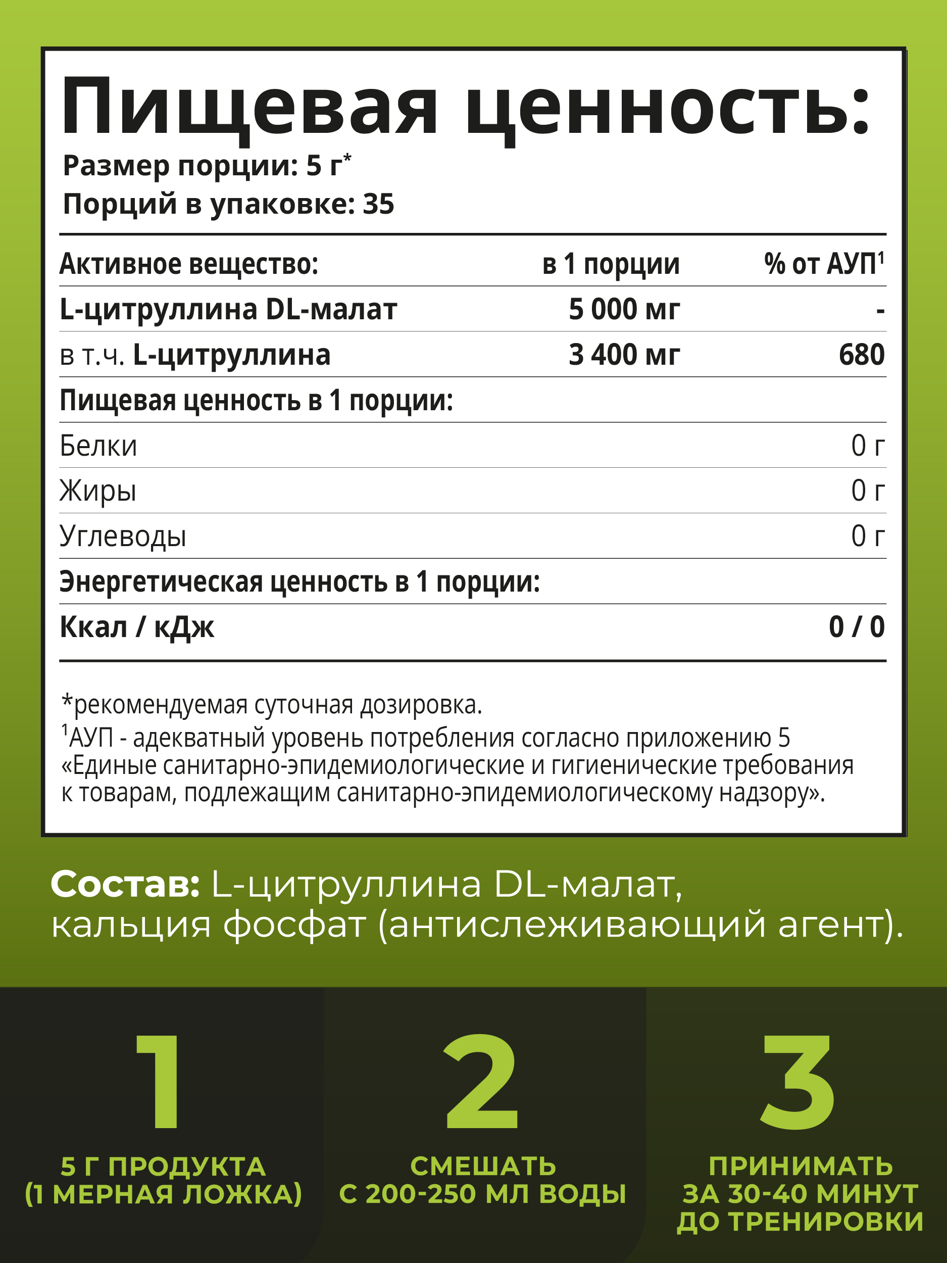 Одна упаковка содержит 175 гр продукта (60 порций). Рекомендуется смешать порцию порошка с 250 мл воды и принимать за 30-40 минут до тренировки. Подходит для мужчин и женщин. Продукт сертифицирован и имеет свидетельство о государственной регистрации.