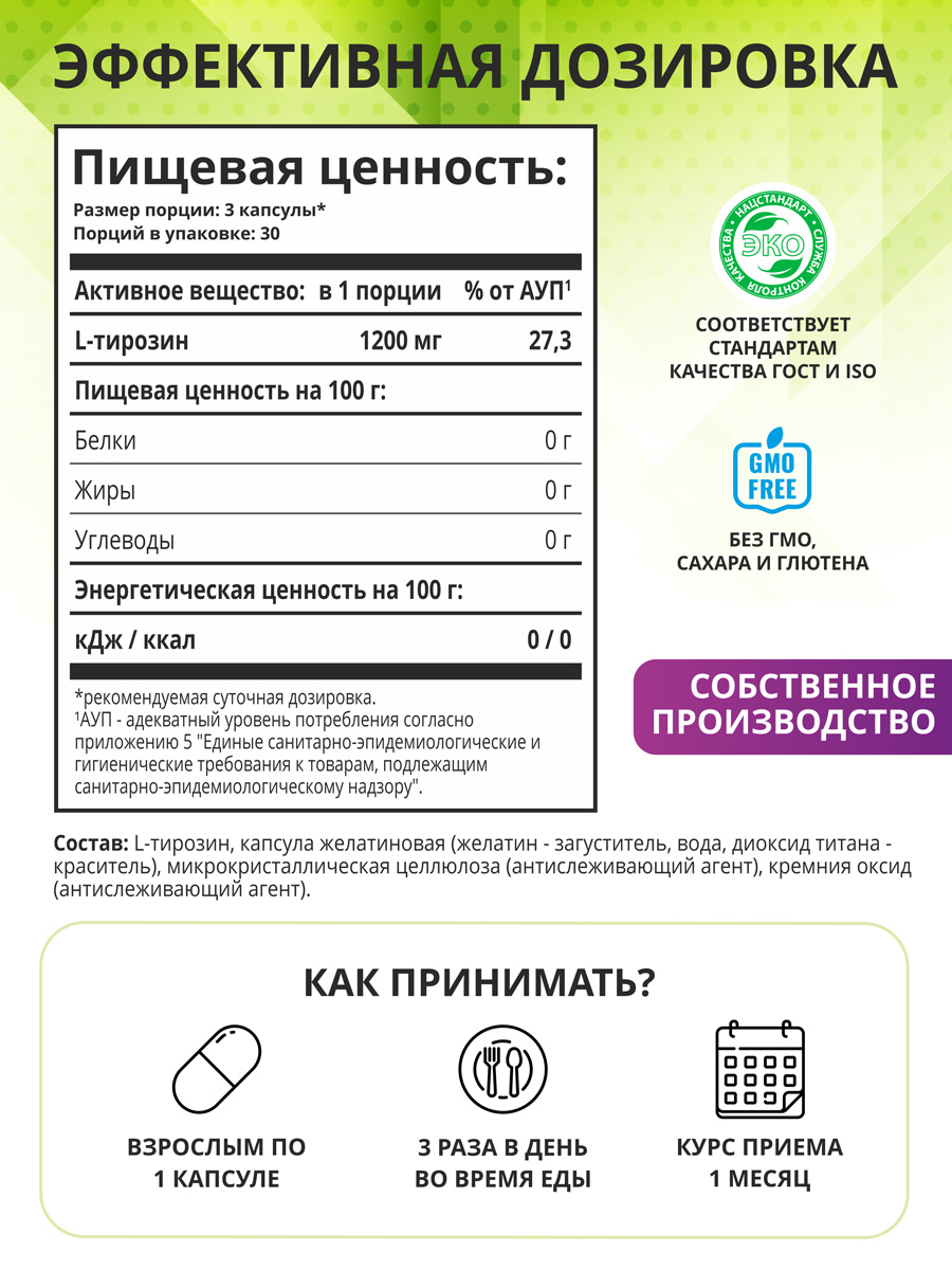 В одной порции (3 капсулы) содержится 1200 мг аминокислоты L-тирозина. БАД противопоказан при заболеваниях щитовидной железы.