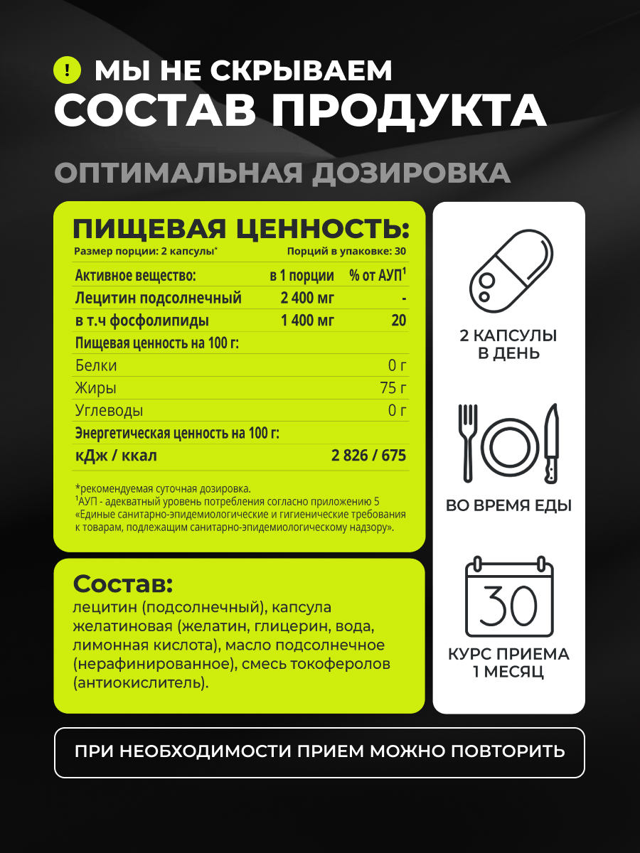Лецитин подсолнечный в капсулах от 1WIN — это источник фосфолипидов, которые снижают холестерин и действуют как витамины для печени и мозга. Натуральный лецитин высокого качества быстро усваивается, обеспечивая организм важными фосфолипидами, улучшая отток и качество желчи. В 1 порции (2 капсулы) содержится 2400 мг лецитина, в том числе 1400 мг фосфолипидов.