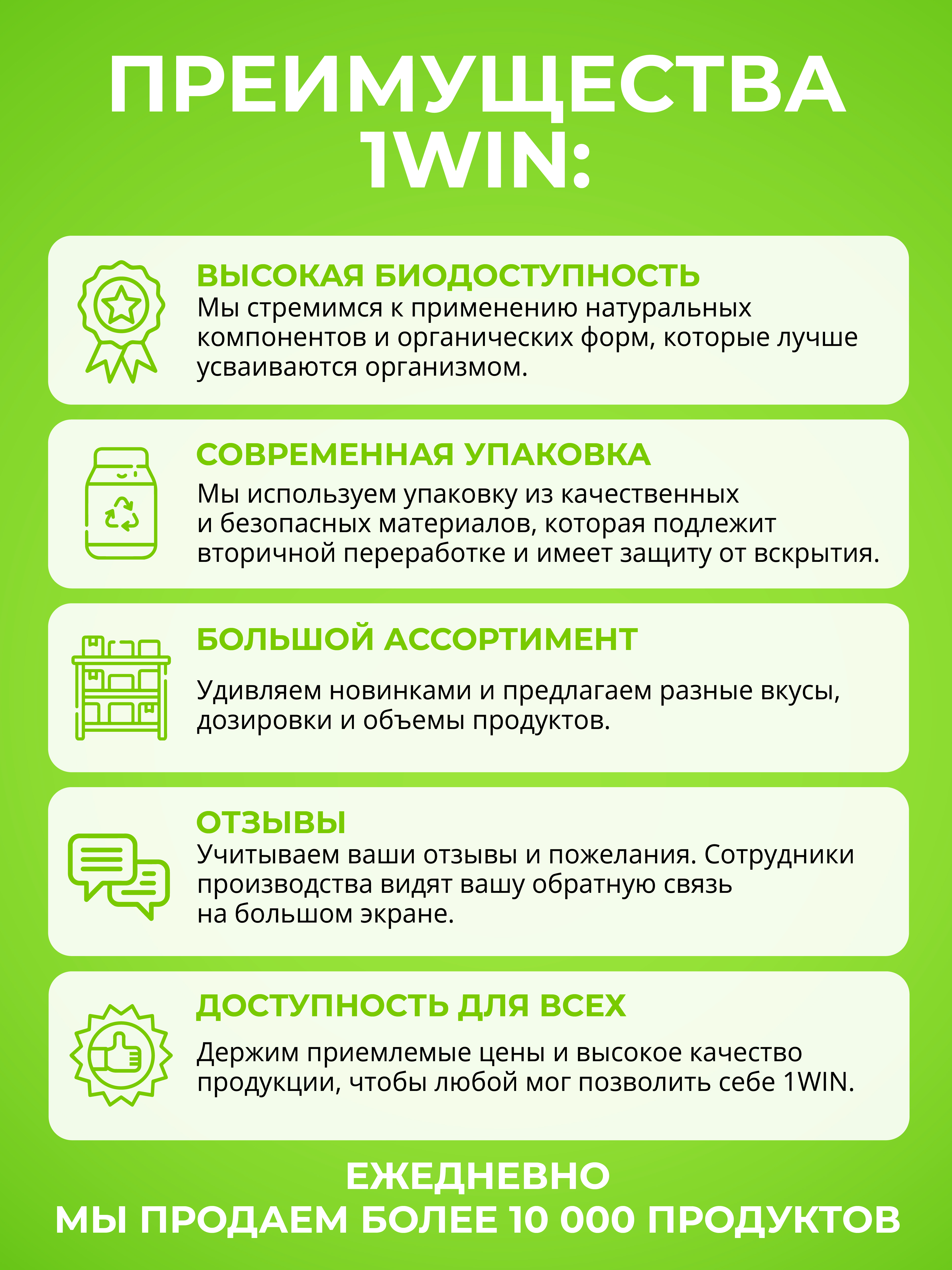 СПП для питания спортсменов и комплексные пищевые добавки от 1WIN сертифицированы, соответствуют международным стандартам качества. Ознакомиться с дозировкой употребления продуктов вы можете на упаковках.