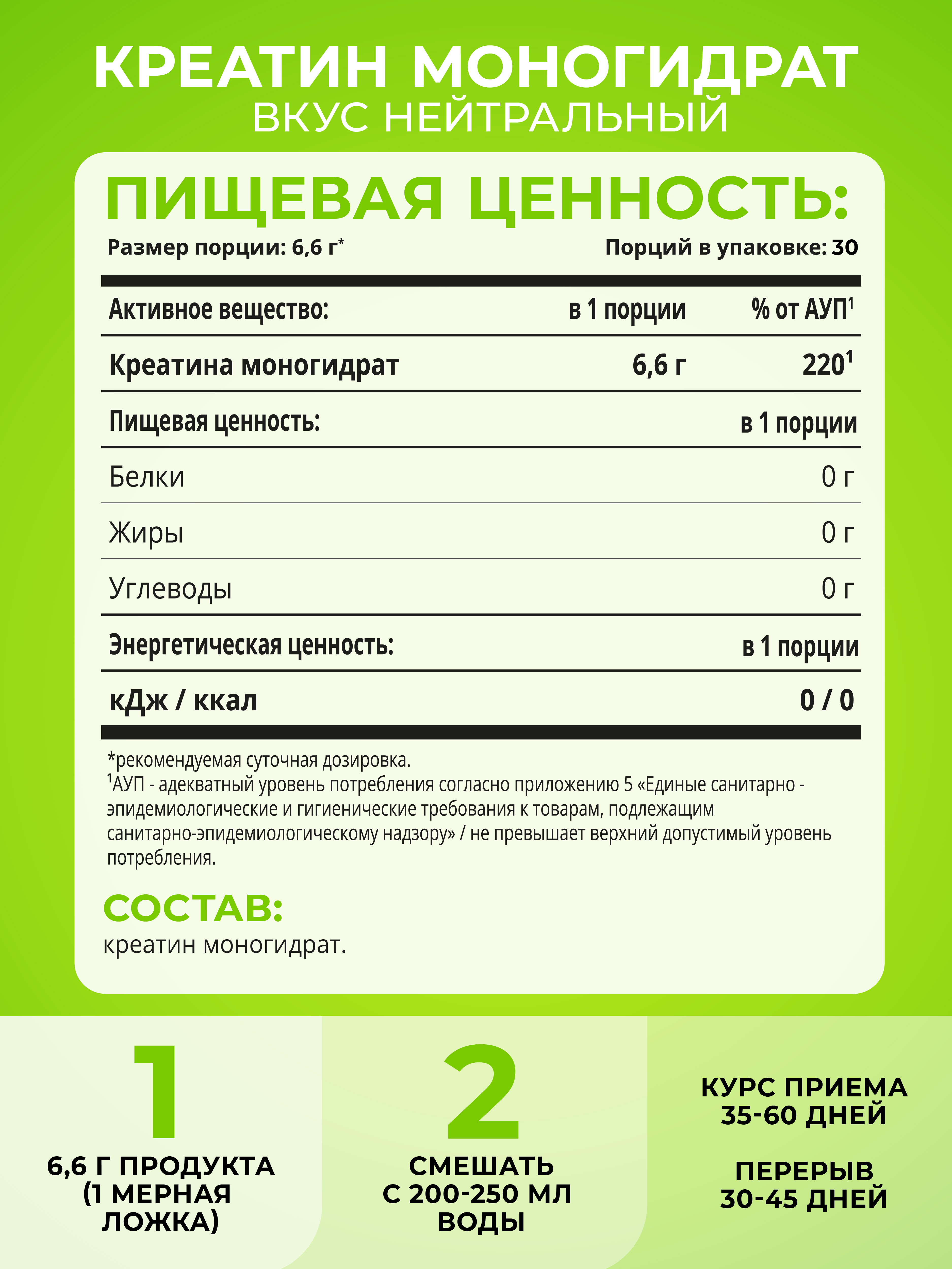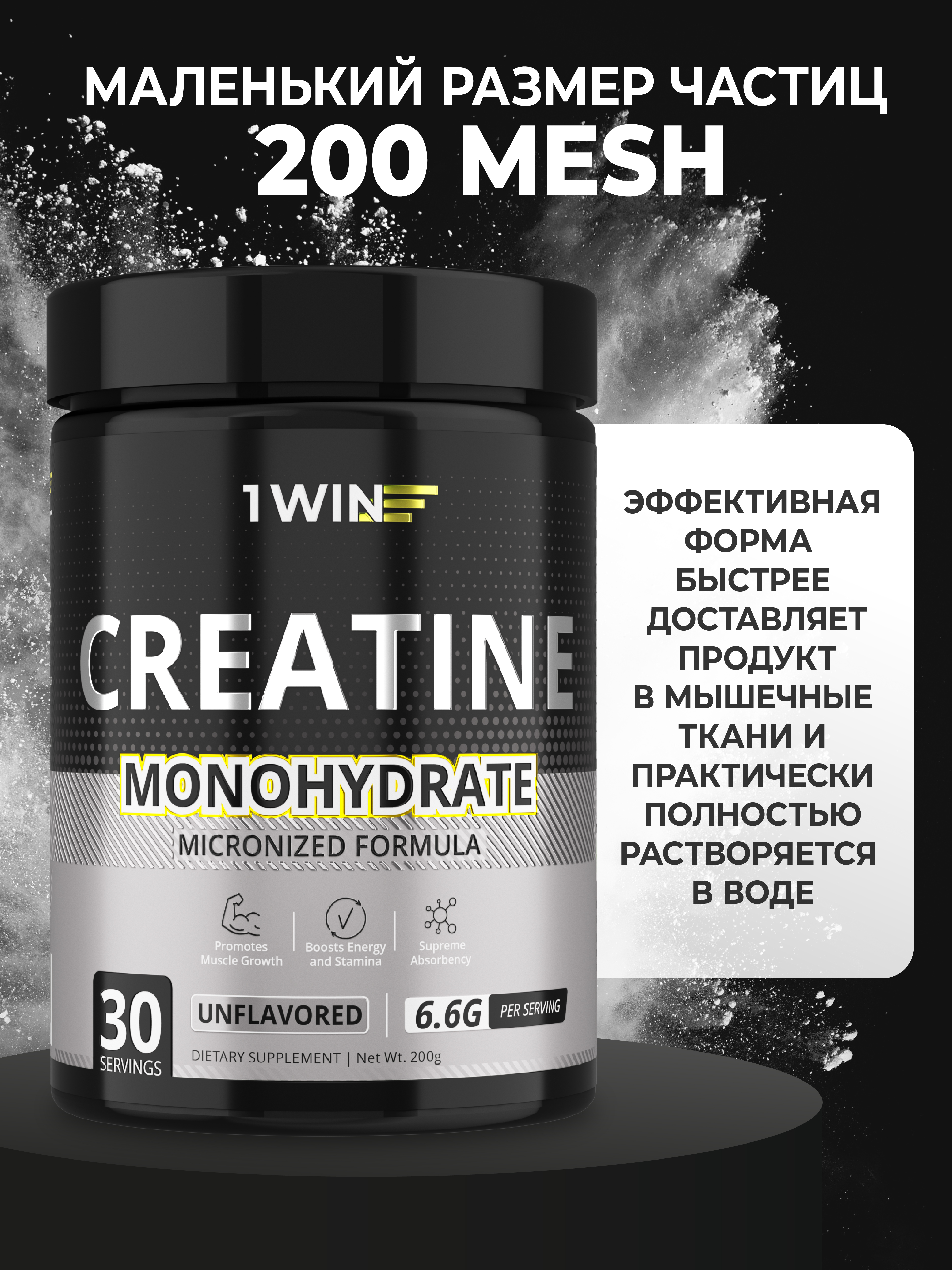 Креатин моногидрат увеличивает физические ресурсы организма. Употребление креатина перед тренировкой обеспечивает выброс энергии во время занятий и увеличивает кратковременную анаэробную выносливость. Добавка содержит микронизированный креатин - наиболее биодоступную форму аминокислоты, которая легко усваивается организмом. В упаковке 200 гр, или 30 порций.
