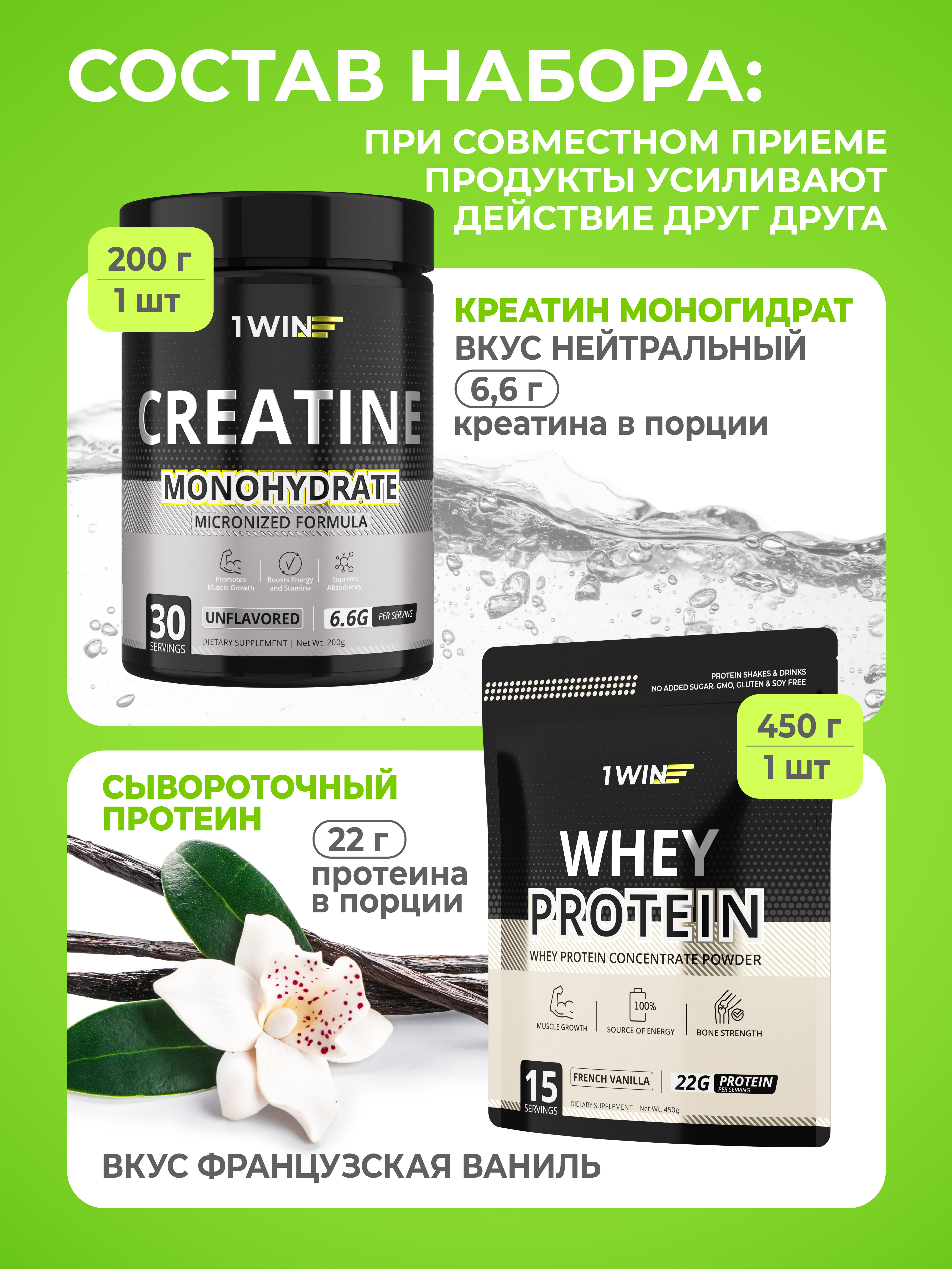 1WIN / Набор спортивного питания Протеин Whey Protein вкус Французская ваниль 900гр + Креатин вкус Нейтральный 200г