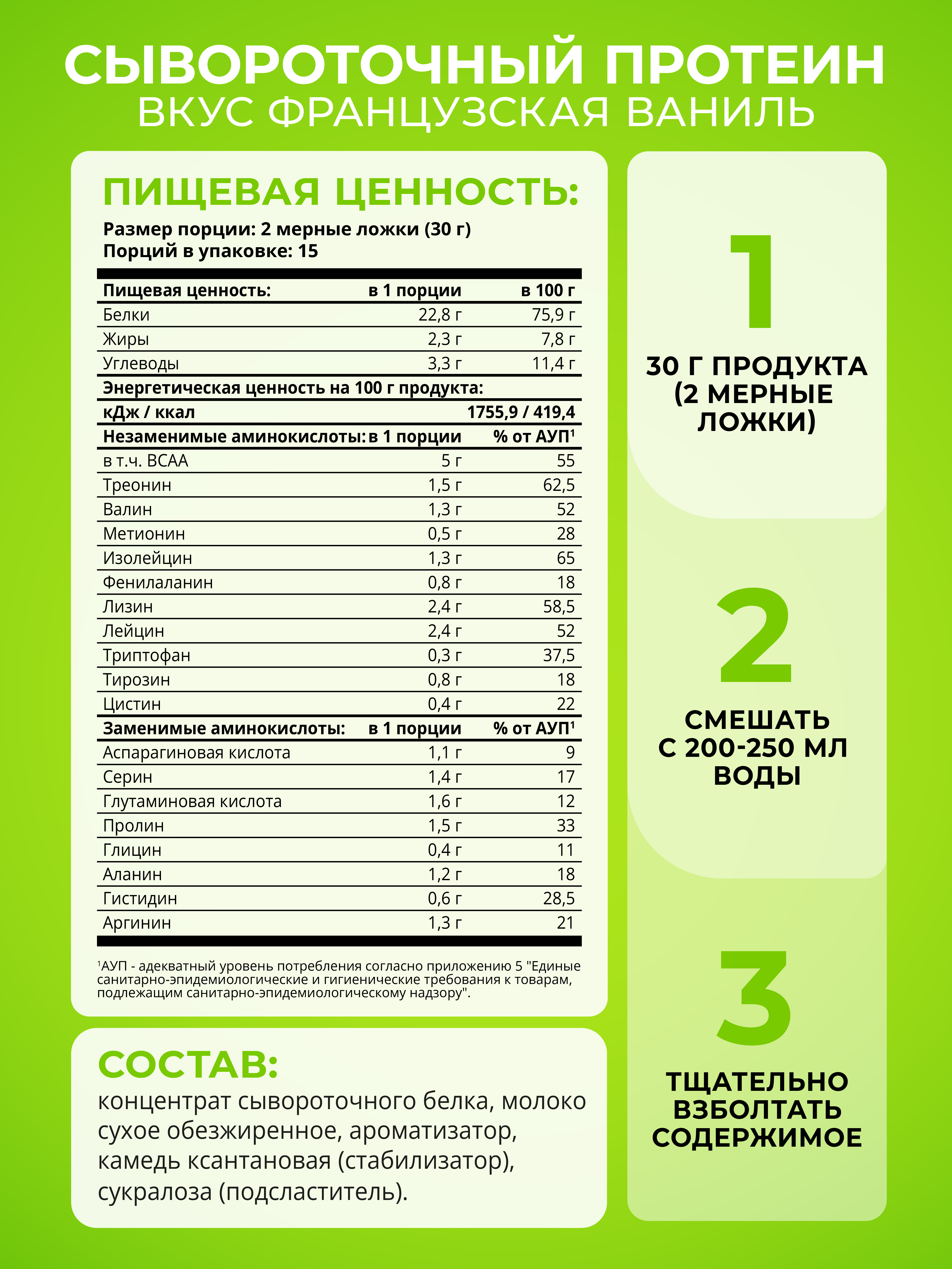Сывороточный протеин - это натуральный белок. Он работает как строительный материал для мышц. Прием протеина необходим в период наращивания мышечной массы и построения рельефа тела. В упаковке 900 гр, или 30 порций.