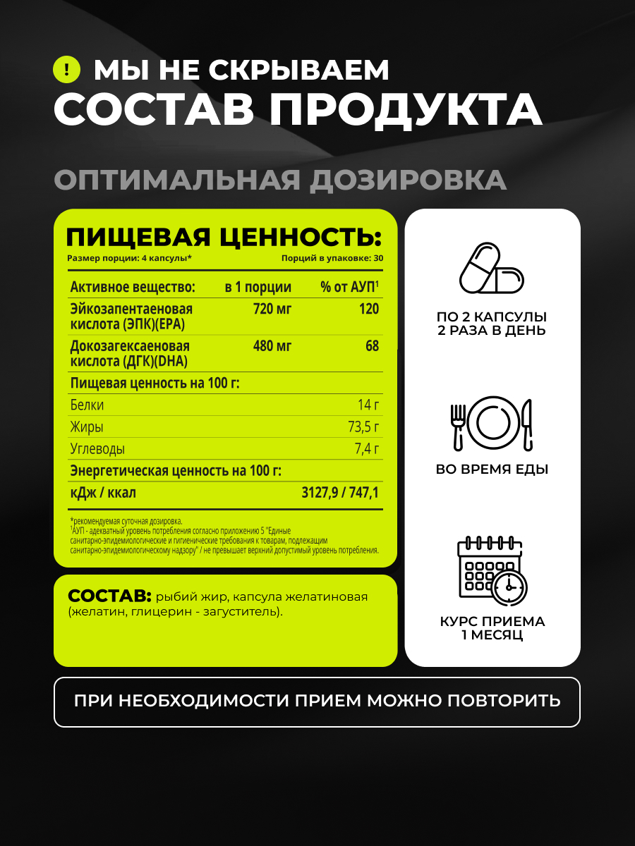 БАД омега-3 XS сертифицирован. В упаковке 120 капсул. Принимайте по 2 капсулы 2 раза в день во время еды. Курс восполнения дефицита омега 3 - 1 месяц. При необходимости повторите прием добавки.