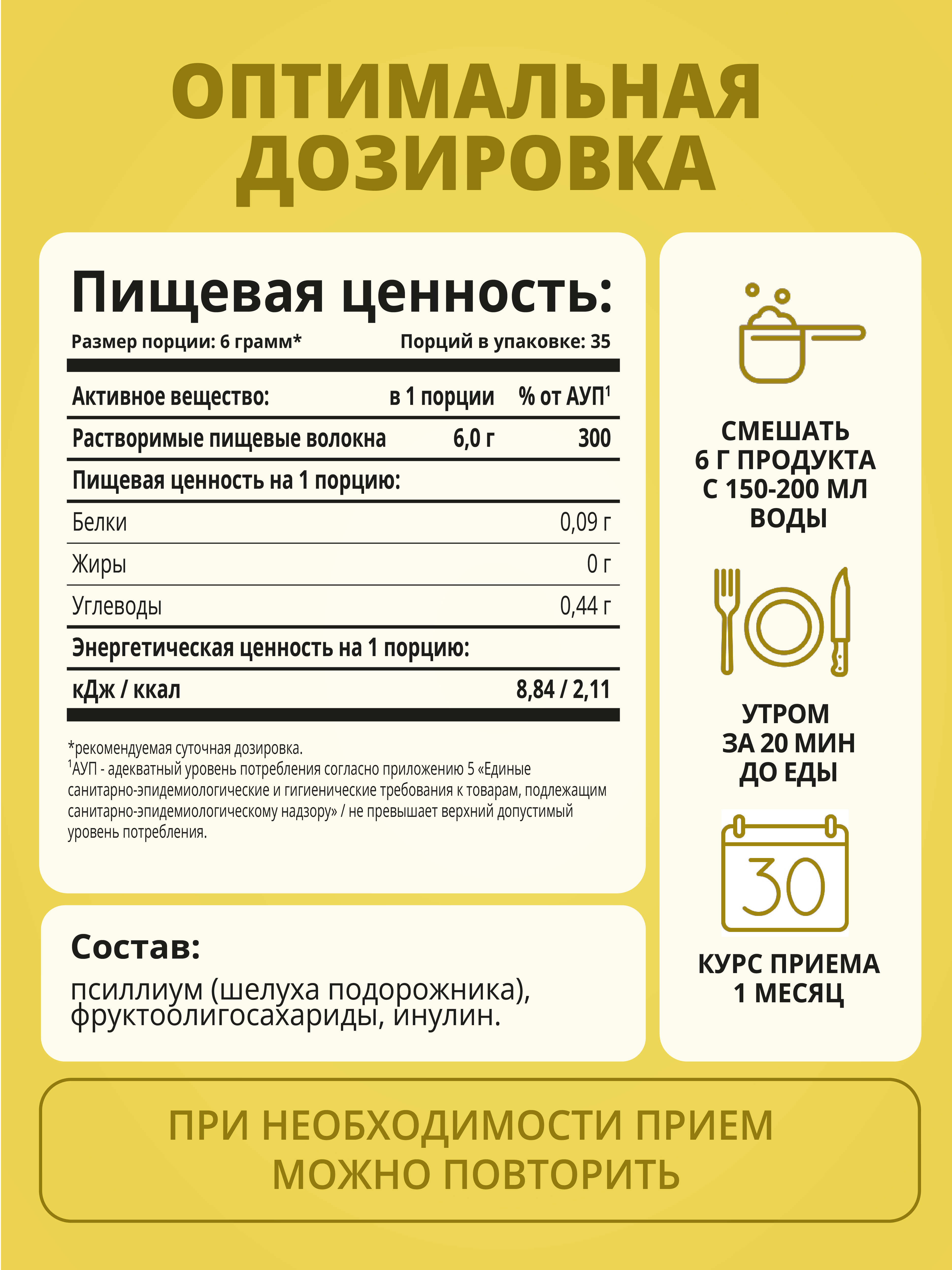 В одной упаковке (210 грамм) содержится 35 порций. Рекомендуется смешать одну мерную ложку продукта с 150-250 теплой воды или другого напитка, тщательно перемешать. Принимать утром за 20 минут до приема пищи и соблюдать питьевой режим в течение дня.