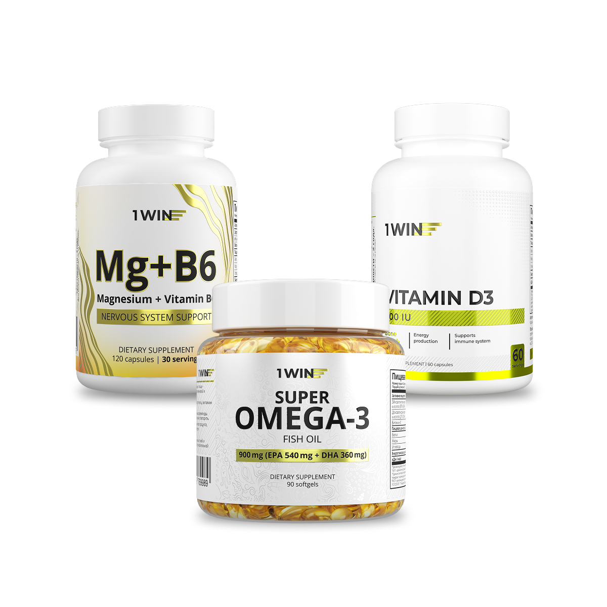 1WIN / Набор витаминов, Омега-3 90 капсул + Магний+В6 120 капсул + подарок витамин D3 600МЕ
