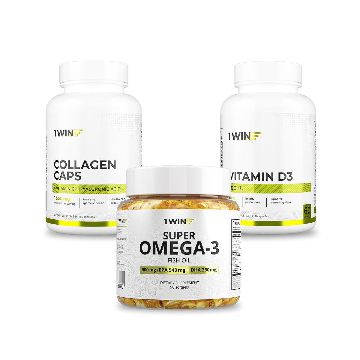 1WIN / Набор витаминов, Омега-3 90 капсул + Коллаген с гиалуроновой кислотой 155 капсул + подарок D3 600МЕ