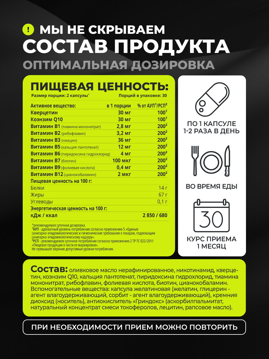 Контрол Тайм Коэнзим Q10 100% от 1WIN — это необходимый витамин, который играет ключевую роль в производстве энергии в клетках, особенно в сердечной мышце. В 1 порции (2 капсулы) содержится Кверцетин 30 мг, Коэнзим Q 10 30 мг и комплекс витаминов группы В.