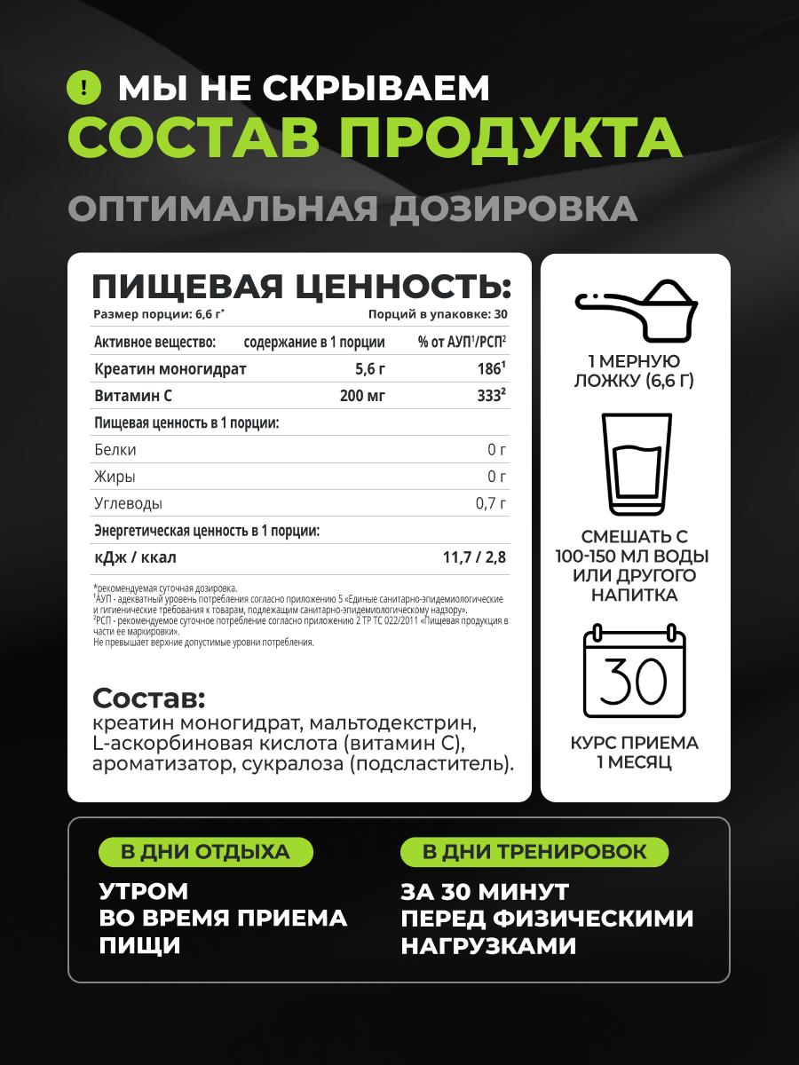 Микронизированная форма креатина является самой биодоступной, легко усваивается организмом в полном объеме. В составе комплекса присутствует мальтодекстрин. Это концентрированный углевод, который способствует лучшему усвоению креатина.