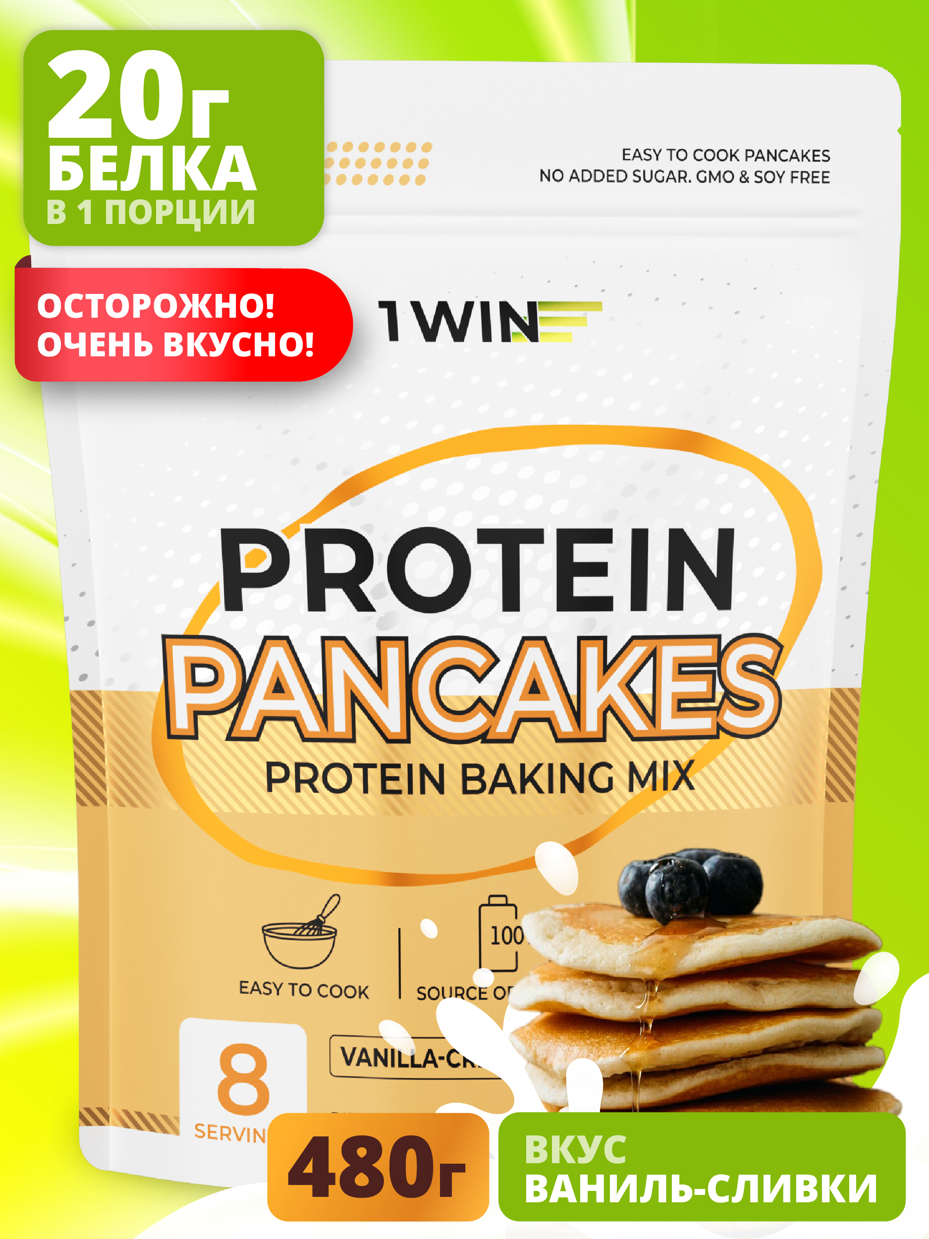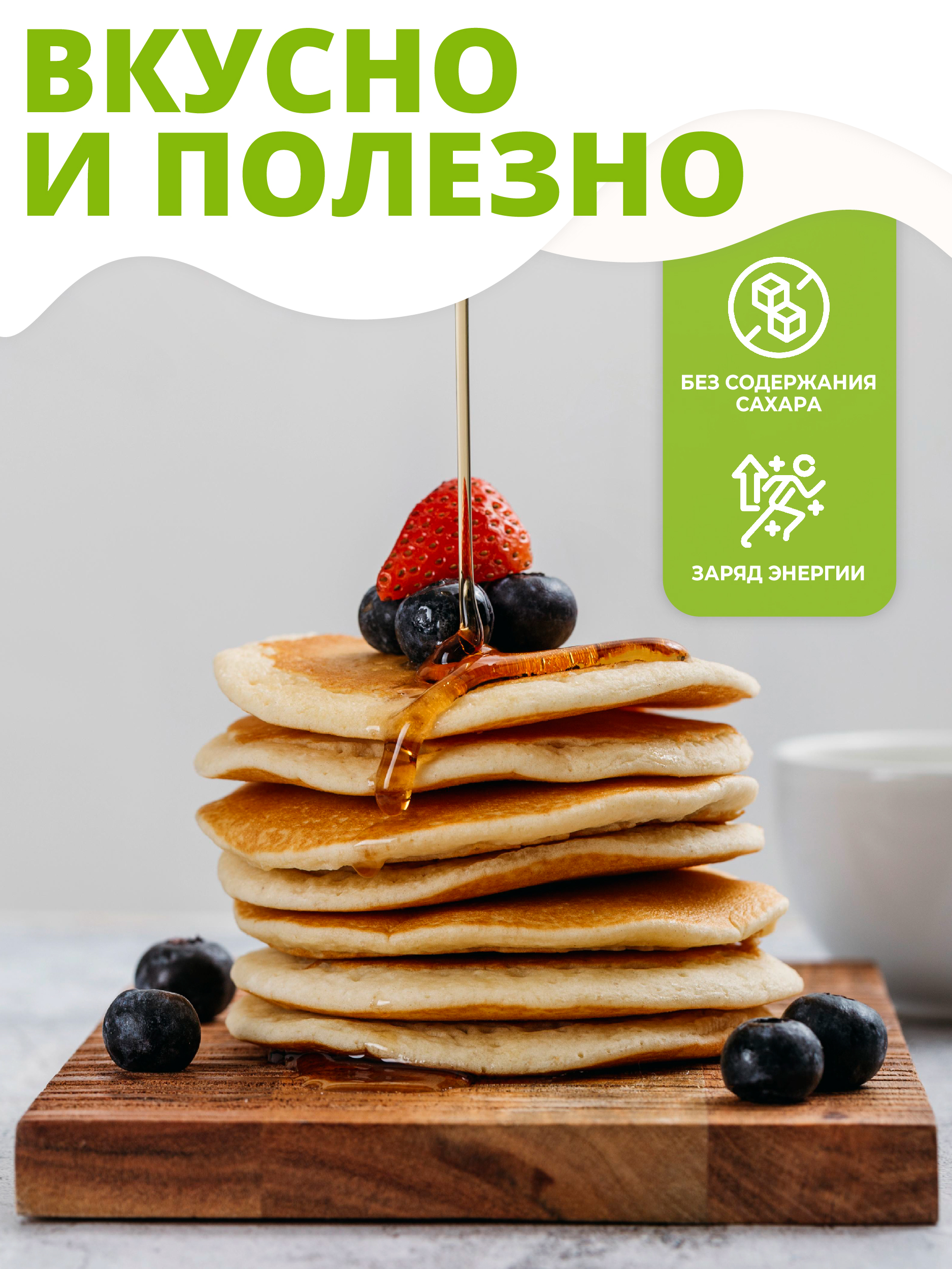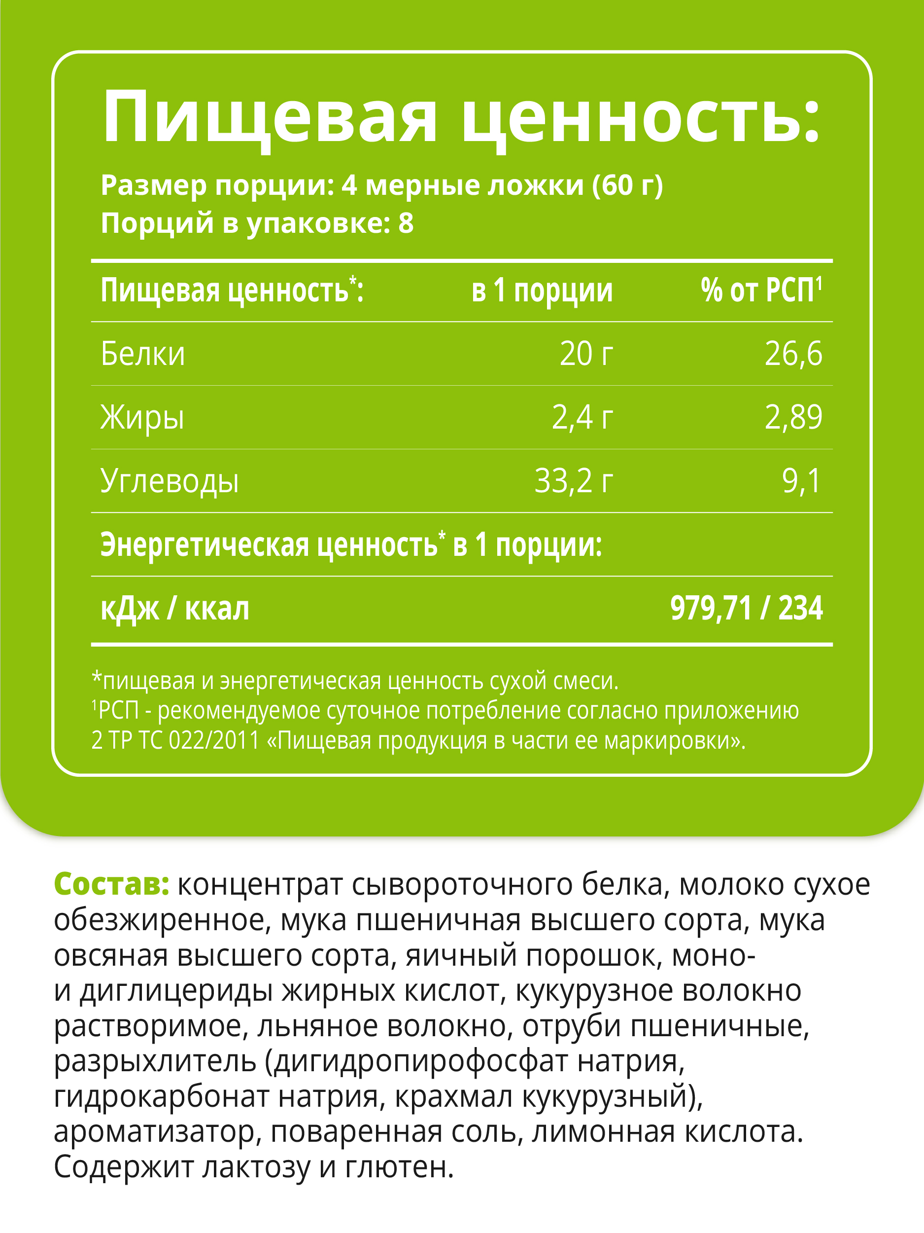 Одной упаковки хватит на 8 порций. Внутри пакета есть мерная ложка. Рекомендуется смешать 60 гр (4 мерные ложки) смеси и 80 мл воды или молока до однородной массы и выпекать до готовности. Готовые блинчики можно есть горячими, а можно взять с собой на работу или в дорогу. Продукт сертифицирован и имеет свидетельство о государственной регистрации.